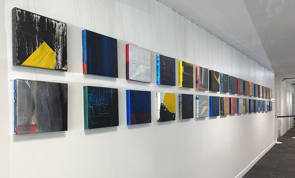 For an exhibition in the salon of the Esperluète bookshop with the JBCQVF association, I chose to show the behind-the-scenes of my studio where I draw, paint, write, imagine projects, and bring them to life. I photograph the stages of my paintings and ideas by projecting images onto the canvases—photos of cities, portraits, colors, sketches, and stained glass and architectural projects. So many bifurcations.